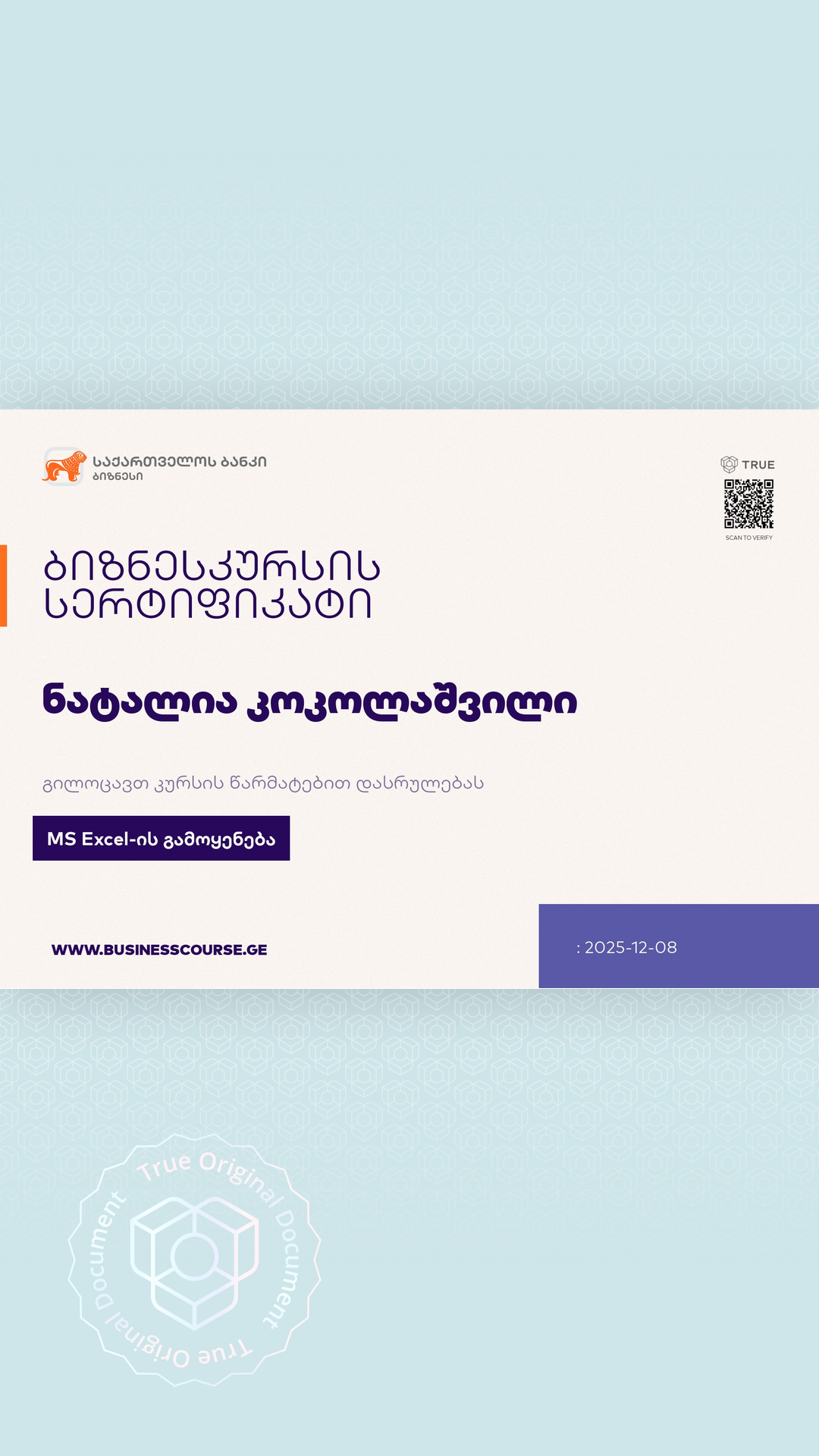 ბიზნესკურსის სერტიფიკატი თქვენი წარმატების გზაზე კიდევ ერთი საინტერესო გამოცდილებაა, რომელიც საქართველოს ბანკთან ერთად გაიზიარეთ.
