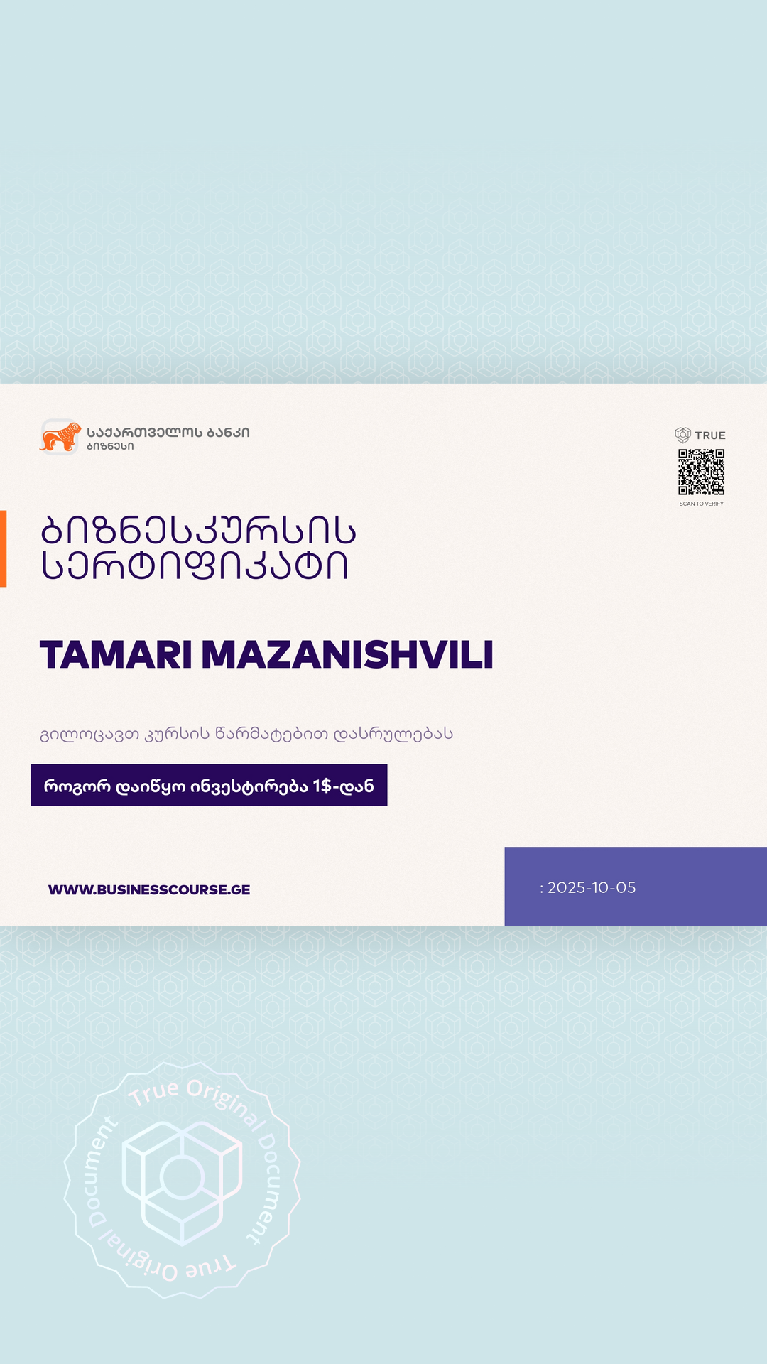 ბიზნესკურსის სერტიფიკატი თქვენი წარმატების გზაზე კიდევ ერთი საინტერესო გამოცდილებაა, რომელიც საქართველოს ბანკთან ერთად გაიზიარეთ.