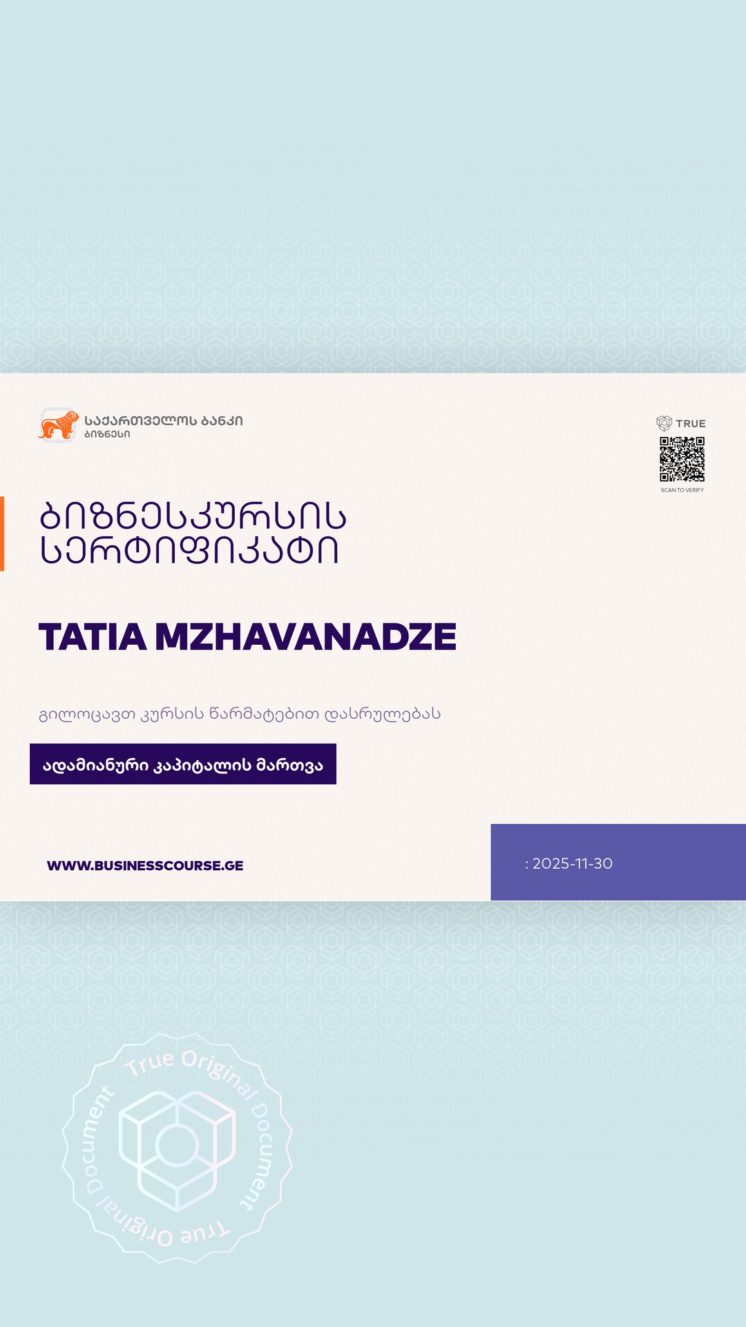 ბიზნესკურსის სერტიფიკატი თქვენი წარმატების გზაზე კიდევ ერთი საინტერესო გამოცდილებაა, რომელიც საქართველოს ბანკთან ერთად გაიზიარეთ.